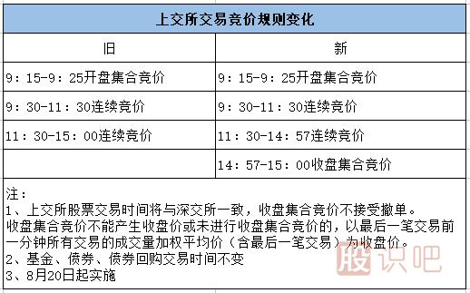 根據上交所此前發(fā)布的《上海證券交易所交易規則》等五項調整后的業(yè)務(wù)規則,自今日(8月20日)起調整股票收盤(pán)交易機制,通過(guò)3分鐘集合競價(jià)方式產(chǎn)生收盤(pán)價(jià),收盤(pán)集合競價(jià)階段為14:57至15:00。