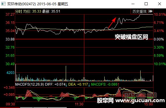 如圖所示,2015年6月5日上午和下午開盤后的一小時(shí)內(nèi),雙環(huán)傳動(002472)股價(jià)一直在較高的位置上橫盤整理。在整理的過程中,市場上的多方力量和空方力量都被持續(xù)消耗,股價(jià)進(jìn)入多空僵持的局面。