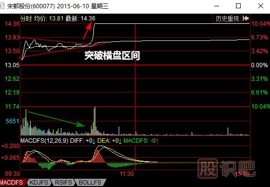 如圖所示,2015年6月10日開盤后,宋都股份(600077)持續(xù)橫盤整理。在橫盤整理過程中,股價(jià)的波動幅度越來越小,同時(shí)成交量也持續(xù)萎縮。這樣的形態(tài)說明市場上的多空雙方力量持續(xù)僵持,并且在僵持的過程中,雙方都被大量消耗。