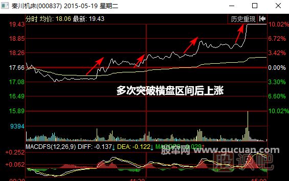 如圖所示,2015年5月19日盤中,秦川機(jī)床(000837)經(jīng)過了連續(xù)多次橫盤后突然上漲的行情。每次股價(jià)橫盤過程中,都說明市場上的多空雙方持續(xù)僵持,而經(jīng)過僵持后股價(jià)持續(xù)上漲則說明多方力量十分強(qiáng)勢,每次都能在僵持的過程中勝出??吹竭@樣的形態(tài)后,投資者可以積極買入股票。
