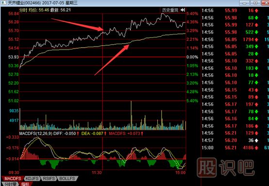 大家看,個(gè)股分時(shí)圖其實(shí)也有2根線(xiàn),黃線(xiàn)、白線(xiàn)。當然,個(gè)股不存在什么權重不權重的,和大盤(pán)不一樣,那么它們又代表什么意思呢?