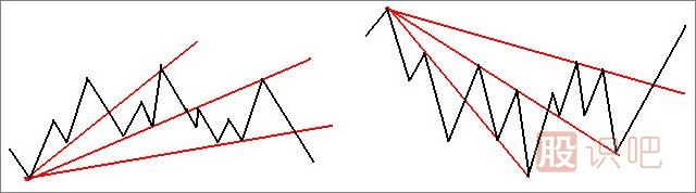 扇形三條線有一個(gè)明顯的特色,趨勢(shì)線之間的夾角大致相等,這可作為協(xié)助我們?nèi)【€的輔助觀察法。