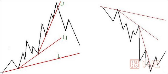 原始上升趨勢(shì)線(基本趨勢(shì)線)、第一上升修正趨勢(shì)線(主趨勢(shì)線)、第二上升修爭(zhēng)趨勢(shì)線(次要趨勢(shì)線)。