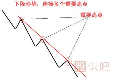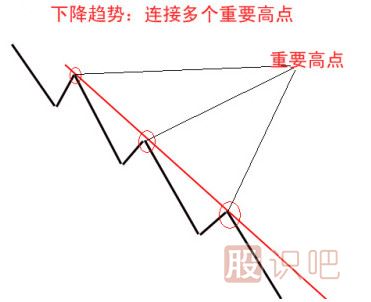 相反,若處于下降趨勢(shì),股價(jià)波動(dòng)必定向下發(fā)展,即使出現(xiàn)反彈也不影響其總體的跌勢(shì),把各個(gè)反彈的高點(diǎn)相連,我們會(huì)驚奇地發(fā)現(xiàn)它們也在一根直線上,我們把這根線稱為下降趨勢(shì)線。