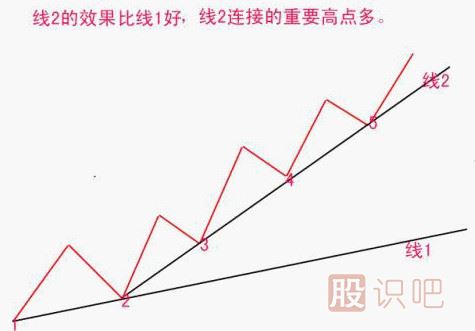 2)找出明顯得兩個(gè)地點(diǎn)(谷底),連成一條向上傾斜的直線,如果該直線不能包括某一段趨勢(shì)段中的所有價(jià)位,那么有必要再去尋找地點(diǎn)來(lái)嘗試,直到包含了某一段趨勢(shì)段的所有價(jià)位.