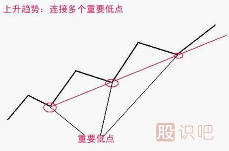 趨勢(shì)線是用劃線的方法將低點(diǎn)或高點(diǎn)相連,利用已經(jīng)發(fā)生的事例,推測(cè)次日大致走向的一種圖形分析方法。我們發(fā)現(xiàn)在各種股價(jià)圖形中,若處于上升趨勢(shì),股價(jià)波動(dòng)必是向上發(fā)展,即使是出現(xiàn)回?fù)跻膊挥绊懫淇傮w的漲勢(shì),如果把上升趨勢(shì)中間回?fù)醯忘c(diǎn)分別用直線相連,這些低點(diǎn)大多在這根線上,我們把連接各波動(dòng)低點(diǎn)的直線稱為上升趨勢(shì)線。