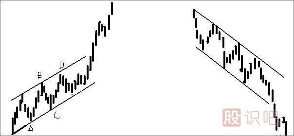 在上漲走勢(shì)中,利用谷底決定上升趨勢(shì)(支撐線),再取并行線切過(guò)股價(jià)波動(dòng)的上緣(壓力線),這兩條線合稱“上升通道”。