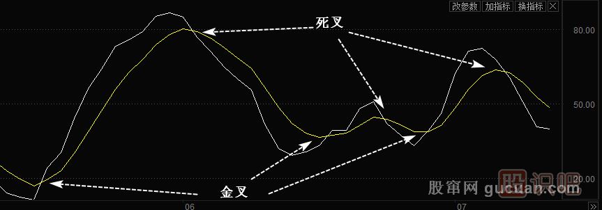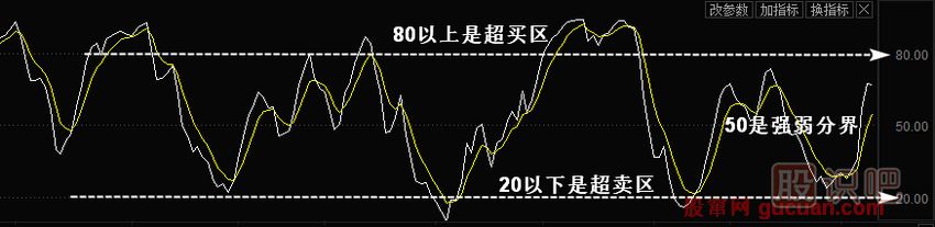 (1)指標的高低。通過(guò)指標數值的高低來(lái)判斷股票強弱,從而提示股票的買(mǎi)賣(mài)時(shí)機。對于擺動(dòng)類(lèi)指標來(lái)說(shuō),它們波動(dòng)范圍一般在0一100之間,如圖1所示在這個(gè)范圍之中,有3個(gè)值用得最多,分別是20、50和80。