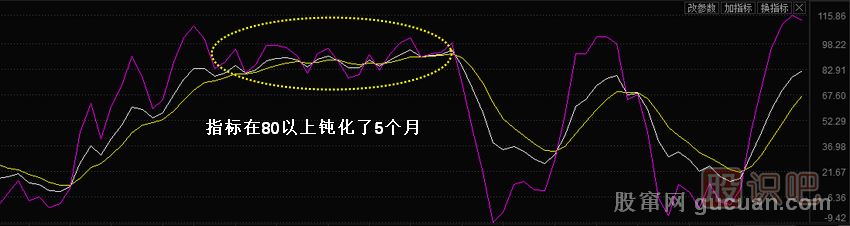 但是,在市場(chǎng)強勢或弱勢特征明顯的時(shí)候,會(huì )出現指標鈍化的現象,如圖2所示。指標鈍化分為兩種:高位鈍化和低位鈍化。高位鈍化是指著(zhù)股價(jià)的上升,指標也會(huì )隨之上升,但指標上升的速度會(huì )越來(lái)越慢,會(huì )形成上升拋物線(xiàn)的形態(tài)一直在超買(mǎi)區域(80以上)中運行生低位鈍化則正好相反。此時(shí),常規做多或做空的操作原則就不適用了。解決的方法可以通過(guò)使用趨勢類(lèi)型的指標,以趨勢的轉折點(diǎn)作為操作的依據。