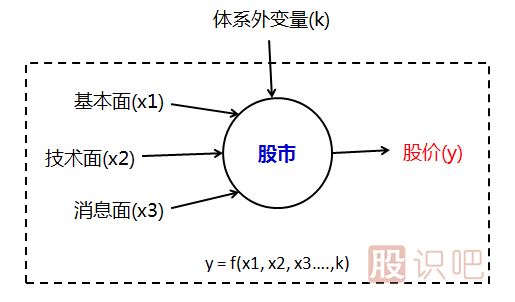 第一, 股價(jià)是個(gè)多變量系統。炒股的人千千萬(wàn)萬(wàn),每個(gè)人買(mǎi)賣(mài)股票的理由也不盡相同,有基于基本面的,有技術(shù)流的,也有聽(tīng)消息,甚至還有憑感覺(jué)亂炒的,不一而足。如果把股市認為是一個(gè)函數的話(huà),那么上述那些影響股價(jià)的因素就是一系列自變量,股價(jià)則是應變量,大致如下圖所示:
