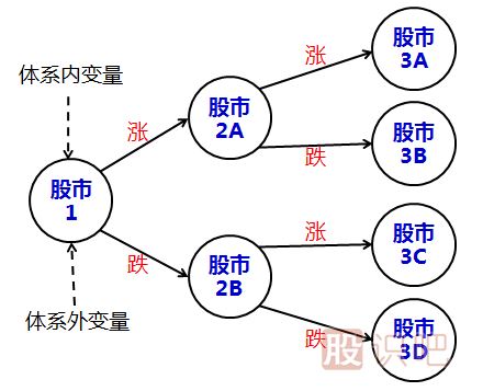 假設某股票市場(chǎng)只有漲跌兩種狀態(tài),無(wú)漲跌幅大小之區分,并假定其初始狀態(tài)是【股市1】,那么股價(jià)下一步的運動(dòng)方向就應該是所有【體系內變量】和【體系外變量】的函數。但是我們上面已經(jīng)闡述過(guò)了,由于體系內變量的超高維性,以及體系外變量的事先不可預知性,所以掌握所有體系內外變量是不可能的,因此也不可能精確預測到股價(jià)的下一步走勢。