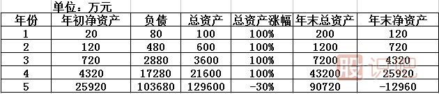 第三年年初凈資產(chǎn)720萬(wàn),借款2880萬(wàn),買(mǎi)下3600萬(wàn)的煤礦,年底煤礦升值為7200萬(wàn)元,自己凈資產(chǎn)4320萬(wàn)。
