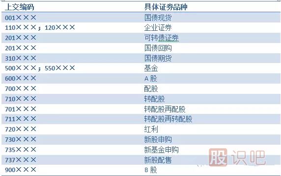 上交編碼:表示在上海證券交易所上市的證券,采用6位數編制方法,前3位數為區別證券品種,具體如下: