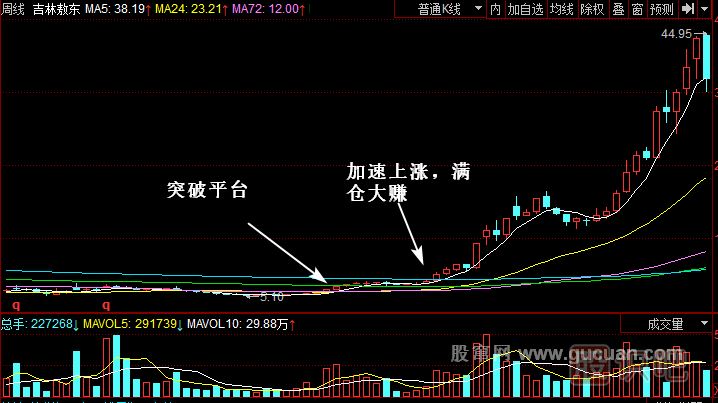 (2)股價(jià)再次突破平臺之后就要滿(mǎn)倉買(mǎi)入,這是大賺的機會(huì )到來(lái)了。