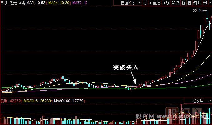 (2)當(dāng)5日線和24日線形成一種漂亮的形態(tài)時,加速上漲就非常近了,采取快速買入是最好的方式。