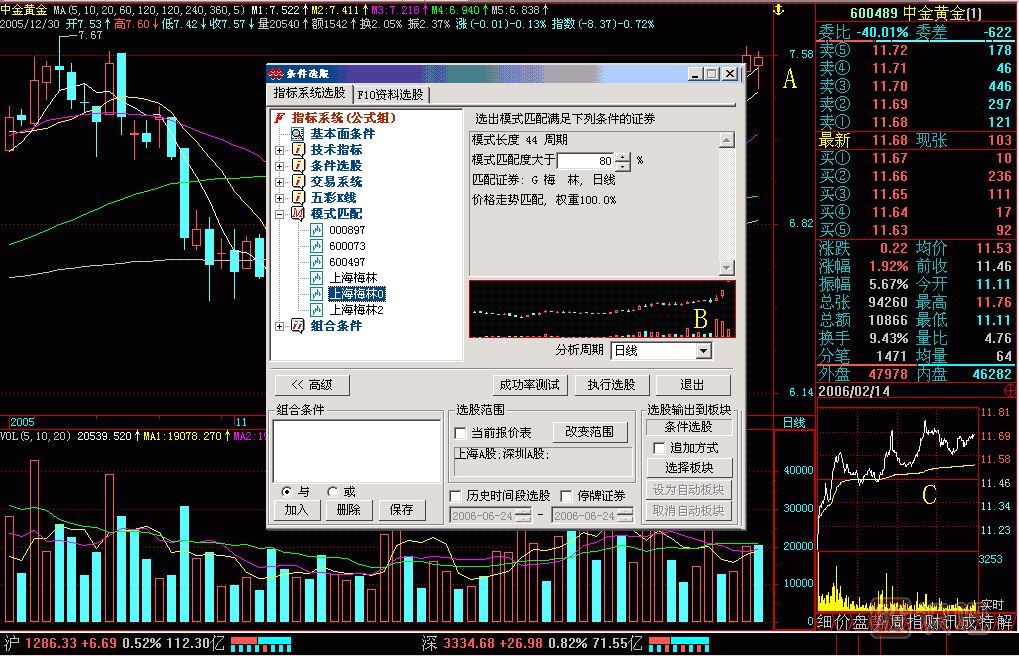 結果選出了600489中金黃金(圖237-2),計算機認為B 形態(tài)與中金黃金A處的形態(tài)有八成相似。如果你對這個(gè)選股條件有信心,不妨在11.68元附近買(mǎi)入,就相當于在上海梅林暴漲前買(mǎi)入。當然,你可以收集任何一個(gè)大黑馬,對暴漲前的各種圖形作好各種選股條件,然后讓計算機去選股。實(shí)踐證明,其選股效率相當高,效果也不錯。你還可以同時(shí)用兩個(gè)條件選股,如既要滿(mǎn)足上海梅林B條件,又要滿(mǎn)足綜藝股份A條件,其選股效果更佳。