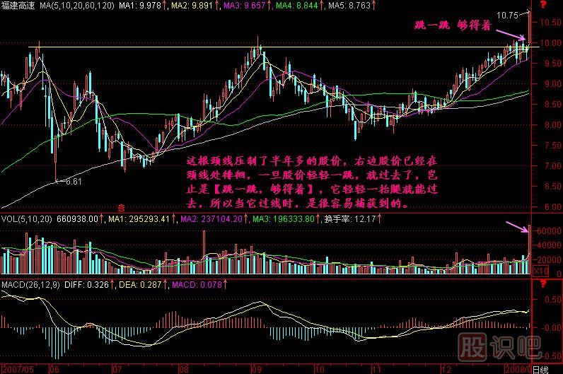 (1)在圖中3.74元的收盤(pán)價(jià)高點(diǎn)作水平線(xiàn)A,就得到頸線(xiàn)。今日k線(xiàn)跳起來(lái),夠得著(zhù)頸線(xiàn),這時(shí)如果放量,就有可能沖過(guò)頸線(xiàn),開(kāi)拓頸線(xiàn)上方的空間。如果今日K線(xiàn)比A線(xiàn)低得多,如一個(gè)漲停板也夠不著(zhù)頸線(xiàn),那就沒(méi)戲。假如跳一跳,夠不著(zhù),又不放量,那就更沒(méi)戲了。運氣好時(shí),還能慢慢漲,運氣不好時(shí),沒(méi)完沒(méi)了地跌,總之,不會(huì )發(fā)動(dòng)大行情的。一個(gè)快速盈利的短線(xiàn)高手,眼球只盯著(zhù)跳一跳夠得著(zhù)的個(gè)股。
