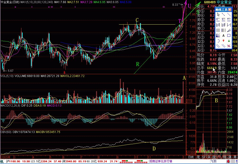 收盤(pán)后,見(jiàn)(圖223-3)所示,放量打拐的圖形就直觀(guān)得多,A點(diǎn)的成交量柱體圖比5日均量線(xiàn)高出2倍有余,明顯放量。日k線(xiàn)原來(lái)的上升速度是R至S的斜率,現在拐成T至U的斜率,顯然是加速度上升。您如果在上午10:09的時(shí)候買(mǎi)入,正好打擊在拐點(diǎn)上,故稱(chēng)為放量打拐。