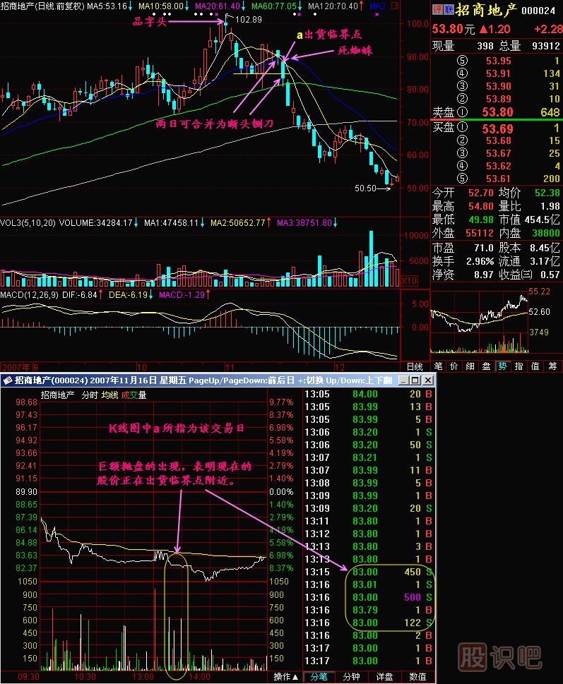 小結:莊家在頭部區間出貨有一個(gè)臨界點(diǎn),這個(gè)臨界點(diǎn)之前股價(jià)是緩慢滑跌,屬于潛派發(fā),而這個(gè)臨界點(diǎn)之后股價(jià)往往快速下跌,屬于強派發(fā),此時(shí)股價(jià)往往出現了三死叉見(jiàn)頂、價(jià)壓、斷頭鍘刀、空方炮等等圖形,這個(gè)時(shí)候最容易出現巨量拋盤(pán)誘發(fā)大跌勢的情況,如果在盤(pán)中發(fā)現這樣的情況,可得要抓緊時(shí)間出貨,否則股價(jià)將會(huì )加速下跌,如果不及時(shí)出貨很容易會(huì )被高位套牢!