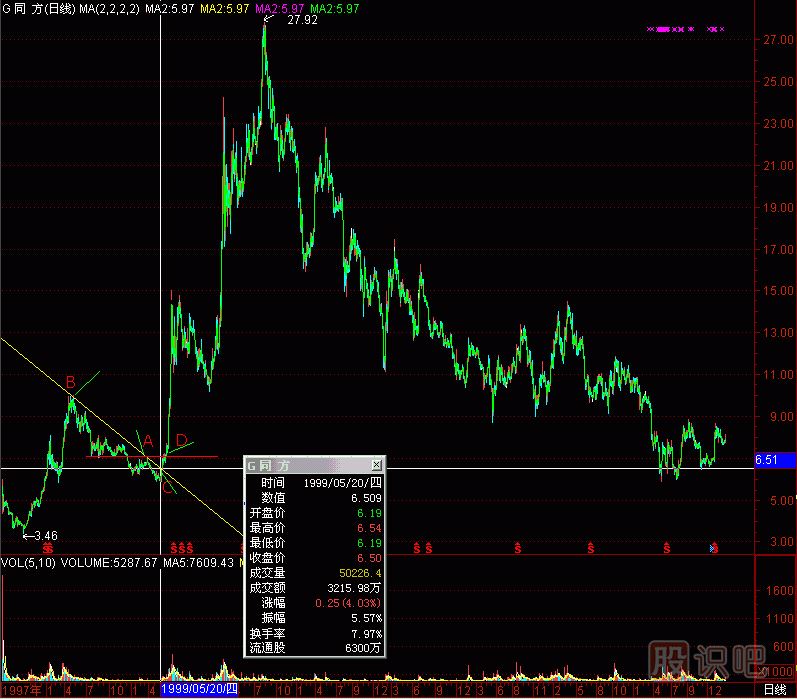 老師:現在分析1999年5月20日清華同方的K線(xiàn)圖,見(jiàn)(圖286-3)。