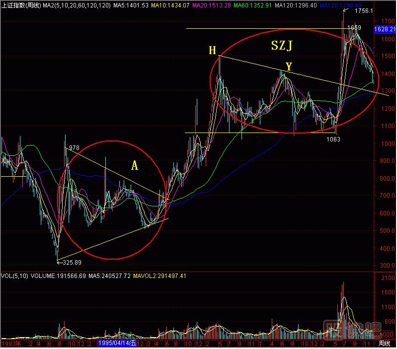 A坨表示1994年7月附近的周K線(xiàn)形狀(在這以前的上海股市規模太小,成交量也太小,所有K線(xiàn)都合并到A坨的范圍之中)。A坨的周K線(xiàn)頂線(xiàn)是978點(diǎn),底線(xiàn)是333點(diǎn)。按2T-1L公式,向上突破坨頂978點(diǎn)后的上升空間高度是:2*978-333=1623點(diǎn)。后來(lái)的上證指數漲到1659點(diǎn),與預測誤差僅36點(diǎn)。