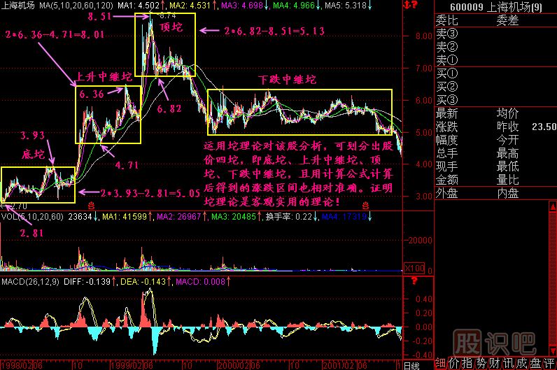“底坨”高點(diǎn)8.28元,低點(diǎn)3.21元。按照廣通坨理論上升公式:2T-1L=2*8.28-3.21=13.35元。以后股價(jià)向上突破,很快就漲到13.35元。“上升中繼坨”高點(diǎn)14.36元,低點(diǎn)9.92元,按照廣通坨理論上升公式:2T-1L=2*14.36-9.92=18.80元,以后股價(jià)向上突破,很快就漲到18.80元并一路飚升,到達23元。