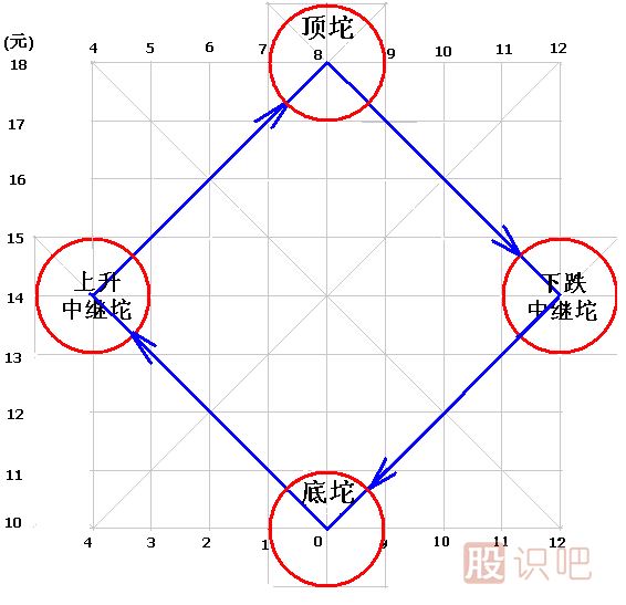 (圖285-5)將底坨2與底坨頭尾相接,得到整理后的四坨循環(huán),這為我們展示了股價(jià)從“底坨-上升中繼坨-頂坨-下跌中繼坨-底坨”的周而復始循環(huán)不息的特點(diǎn)。