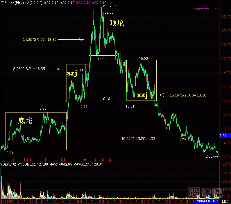 (圖285-4)是000403三九生化的日k線(xiàn)圖,從中可以清晰地看出“四坨”:“底坨”和“頂坨”,以及“上升中繼坨”(用SZJ表示)和“下跌中繼坨”(用XZJ表示)。