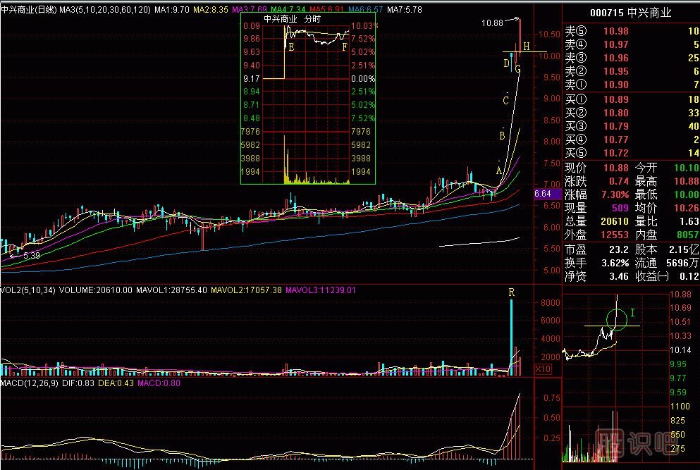 000715中興商業(yè),在停牌近三個(gè)月后,于5月19日復牌(圖272-1)。連續三個(gè)漲停板,如同沖擊鉆經(jīng)過(guò)軟墻體,有撲空的感覺(jué)。從市場(chǎng)意義來(lái)說(shuō),停牌三個(gè)月,正是指數的大好時(shí)光,個(gè)股補漲要求。另外,該股本來(lái)就是莊股,從過(guò)去一年的K線(xiàn)走勢就能看出來(lái),復牌后,莊家自然要拉升股價(jià)。前天停牌一小時(shí)后(見(jiàn)圖中E點(diǎn)),股價(jià)開(kāi)始橫盤(pán)。下午第一小時(shí),股價(jià)還有回落,好像是沖擊鉆遇到硬層,發(fā)生鉆頭的彈跳。從市場(chǎng)意義上說(shuō),在四天四個(gè)漲停板后,賣(mài)出籌碼的量很大,買(mǎi)入力量有點(diǎn)薄弱,所以股價(jià)回落。何人在賣(mài)出籌碼?如果是散戶(hù)的浮動(dòng)籌碼,這很正常,也不影響該股未來(lái)的上漲行情。如果是莊家反手出貨,那也有可能,只是該股未來(lái)的上漲空間就有限了,除非是甲莊出貨乙莊進(jìn)貨。F點(diǎn)是股價(jià)開(kāi)始上升,買(mǎi)盤(pán)賣(mài)盤(pán)的籌碼統吃了,可理解為有資金進(jìn)場(chǎng);但收盤(pán)價(jià)仍然低于開(kāi)盤(pán)價(jià),D點(diǎn)是當天收錘頭陰線(xiàn),R點(diǎn)是十分難看的白色的巨量柱體,有出貨的嫌疑。