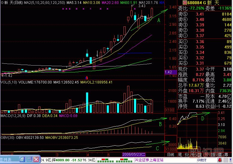 如果有兩個(gè)“空中加油”形態(tài)的股票,一個(gè)油管暢通,另一個(gè)油管閉合,就應選擇前者買(mǎi)入。圖中B點(diǎn)是MACD油管暢通,這是強勢表現。C點(diǎn)是OBV油管暢通,表示做多能量也能暢通。D點(diǎn)是分時(shí)走勢油管暢通,表示短線(xiàn)走強。這些大大小小的油管都暢通,確保“空中加油”能順利完成,這種形態(tài)是安全的買(mǎi)入信號。