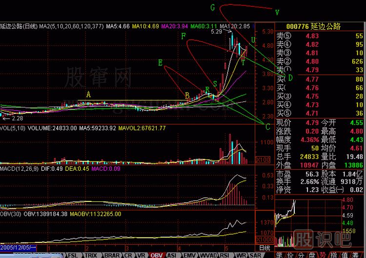 (圖269-1)是000776延邊公路的日K線(xiàn)圖,A點(diǎn)是前高點(diǎn),回檔后呈“量芝麻點(diǎn)”,然后重新回到60日和120日平均線(xiàn)之上。B點(diǎn)沖過(guò)A點(diǎn),是標準的買(mǎi)入點(diǎn);但漲勢到E點(diǎn)調頭向下,這時(shí)很難判斷該股做莊是否出了問(wèn)題,在R點(diǎn)作賣(mài)出。