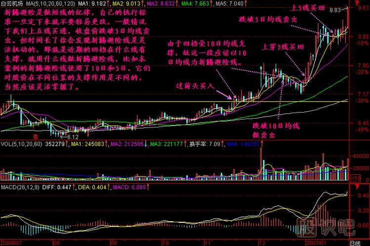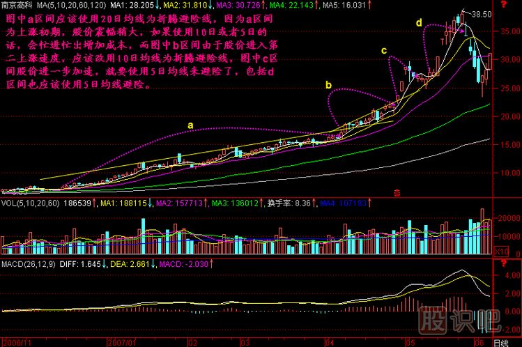 一般情況下,對于技術(shù)生疏的朋友,可以使用類(lèi)似我們前面曾講過(guò)的6字買(mǎi)賣(mài)法來(lái)死板的操作,而對于技術(shù)稍好的朋友,也許可以靈活掌握。比如在上漲初期,由于莊家建倉洗盤(pán)的需要,股價(jià)振幅會(huì )稍大,這個(gè)時(shí)候使用20日均線(xiàn)來(lái)折騰避險就顯得穩定些,避免了頻繁的進(jìn)出,這個(gè)時(shí)候股價(jià)往往是第一或者第二上漲速度,而隨著(zhù)行情的繼續,股價(jià)突破上升通道壓力線(xiàn)加速上漲的時(shí)候,就要及時(shí)把折騰避險線(xiàn)調整為10日、甚至5日均線(xiàn)了,因為股價(jià)進(jìn)入加速上漲之后,一旦下跌跌破5日均線(xiàn),有可能造成獲利盤(pán)蜂擁而出,如果莊家也乘機出貨,而你不及時(shí)在股價(jià)跌破5日均線(xiàn)處賣(mài)出的話(huà),就被動(dòng)了,這個(gè)時(shí)候使用20日均線(xiàn)來(lái)避險顯然就不對了,而使用5日均線(xiàn)可大大提高靈敏度。