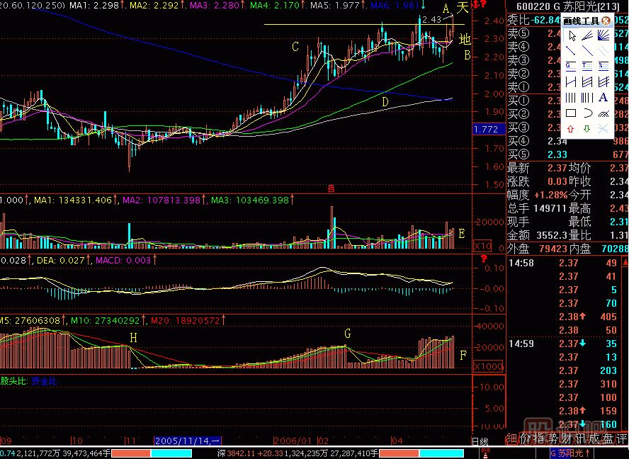 今天上課我們也講盤(pán)股開(kāi)天地,盤(pán)股乃盤(pán)整之股。(圖258-1)是600220G蘇陽(yáng)光的K線(xiàn)圖,最近兩個(gè)月一直在盤(pán)整,它頂著(zhù)天空,盤(pán)得不可開(kāi)交。傳說(shuō)當年盤(pán)古于天地渾沌之間。用一把斧子,把天地劈開(kāi)的。股價(jià)要結束目前這種盤(pán)局,也需要一把斧子,這就是一根巨量大陽(yáng)線(xiàn)!只要大陽(yáng)線(xiàn)出來(lái),天地肯定分開(kāi),一輪漲勢洶涌澎湃。