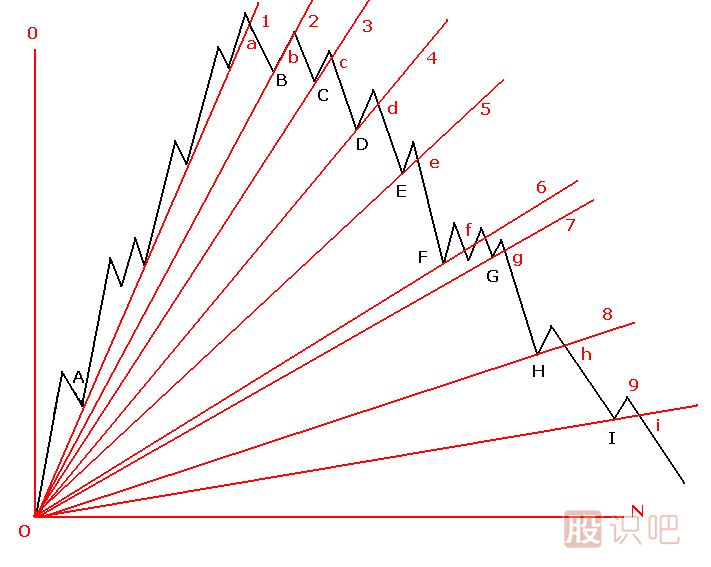 3、(圖287-2)中第二個(gè)股價(jià)低點(diǎn)是股價(jià)上升過(guò)程中的“B”,然后與“O”點(diǎn)作第2條直線(xiàn)。依此類(lèi)推,畫(huà)出N條直線(xiàn)(第N條直線(xiàn)等于水平線(xiàn));
