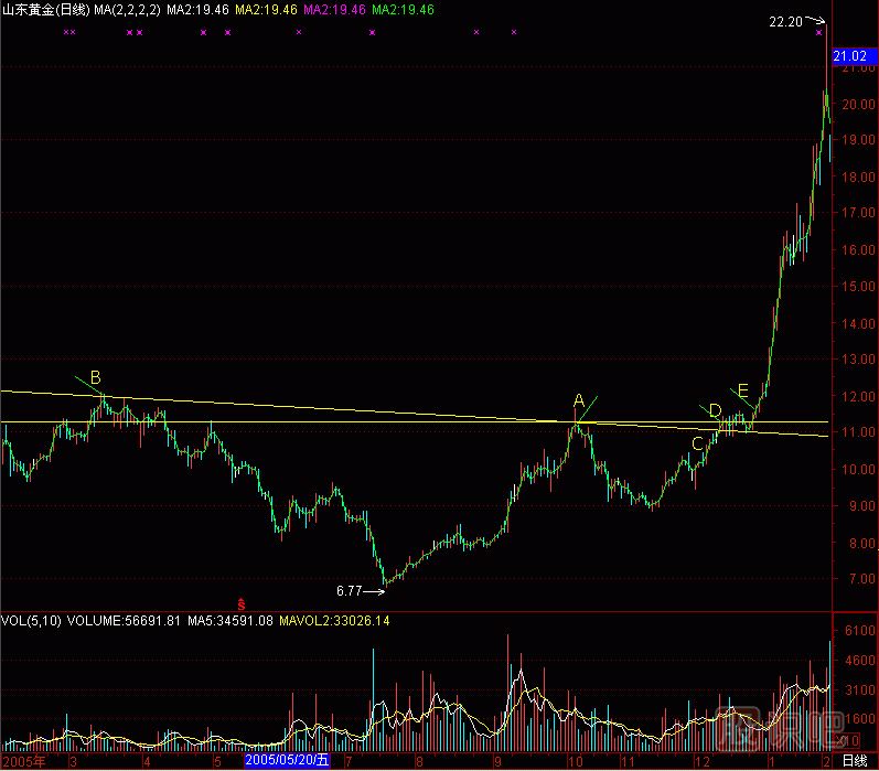 清華同方的股價(jià)從B點(diǎn)的10.11元,經(jīng)過(guò)11個(gè)月的下跌,到達C點(diǎn)的5.92元,成交量極度萎縮。顯然,整個(gè)B、C和最低點(diǎn)3.46元的大三角形,是莊家收集籌碼的“底坨”,既然是“底坨”,等待洗盤(pán)完畢后,就必然會(huì )展開(kāi)主升浪。從A點(diǎn)作“水平攔截線(xiàn)”,就取得D點(diǎn)的買(mǎi)入點(diǎn),用前高點(diǎn)B和A點(diǎn)作“斜下攔截線(xiàn)”,就取得C點(diǎn)的買(mǎi)入點(diǎn)。這樣,筷子線(xiàn)就形成了。而那天收盤(pán)后做電視節目時(shí),股價(jià)已觸及B、A“斜下攔截線(xiàn)”。因此判斷,股價(jià)有向上突破“筷子線(xiàn)”展開(kāi)主升浪的可能。