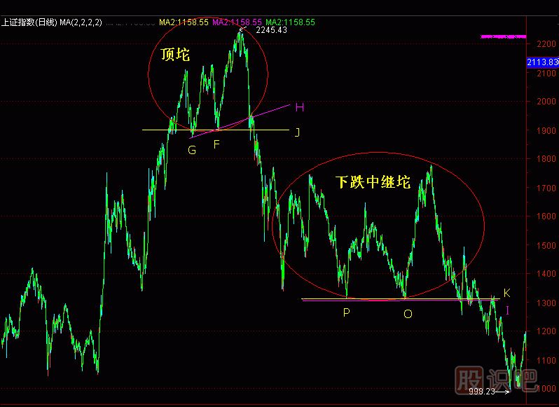 (圖286-5)是上證指數從2245點(diǎn)跌到998點(diǎn)的日K線(xiàn)圖。 “頂坨”的低點(diǎn)F作“水平攔截線(xiàn)”,得到J點(diǎn)攔截點(diǎn)。另一個(gè)低點(diǎn)G與F作“斜上攔截線(xiàn)”,得到H攔截點(diǎn)。這兩條線(xiàn)就是“筷子線(xiàn)”。當上證指數從“頂坨”跌破H點(diǎn)后,發(fā)生了“坨突破”,這時(shí)應準備清倉出貨。當上證指數跌破J點(diǎn)后,意味�派現ぶ甘黃�“筷子線(xiàn)”的支撐,向下破位。破位后的跌勢往往是勢不可擋,一泄一大截。“頂坨”向下破位這段行情,是我們必須躲避的行情,否則損失是巨大的。