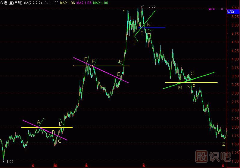(圖286-6)是 600780G通寶的日K線(xiàn)圖,從中可以清晰地看到四雙“筷子線(xiàn)”。A高點(diǎn)是“底坨”上方的“筷子線(xiàn)”,得到C、D兩個(gè)攔截點(diǎn),在這里買(mǎi)入,得到D、F之間的巨大利潤。而在A(yíng)點(diǎn)“筷子線(xiàn)”以下,大部分是盤(pán)整行情,很難盈利。所以有句話(huà):“只做坨突破,不做坨盤(pán)整”。“上升中繼坨”的高點(diǎn)E處有兩條“筷子線(xiàn)”,得到G、H攔截點(diǎn),這又是一次買(mǎi)入的好機會(huì ),從而得到H、Y間的巨大利潤。