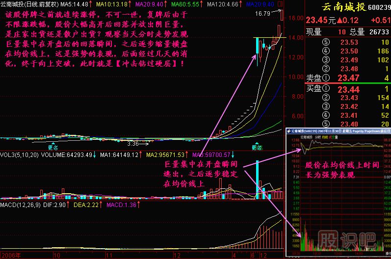 股價(jià)在連續的暴漲后也會(huì )遇到壓力,這個(gè)時(shí)候往往放出巨量,有時(shí)候還是陰巨量,這就像沖擊鉆遇到硬層一樣,這個(gè)時(shí)候要觀(guān)察分時(shí)走勢,如果走勢基本強勁的,說(shuō)明主力并沒(méi)有出貨,其實(shí)你從側面想想也知道,突然漲那么高,散戶(hù)看到放出巨量,一定怕得要命,早就在震蕩中出逃了,主力是不可能在當日出逃的,沒(méi)人有這個(gè)膽量來(lái)這么高的地方接盤(pán),所以只能是散戶(hù)在出逃,而主力在吸納護盤(pán),主力要出貨只有華山一條路——漲!而一旦股價(jià)橫盤(pán)完畢向上突破瞬間,就是沖擊鉆過(guò)硬層,股價(jià)還有慣性上升,投資者可抓緊機會(huì )買(mǎi)入!