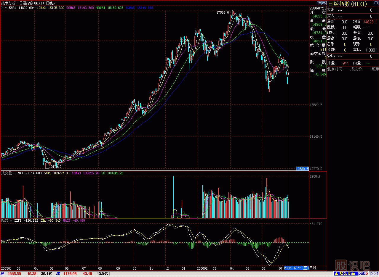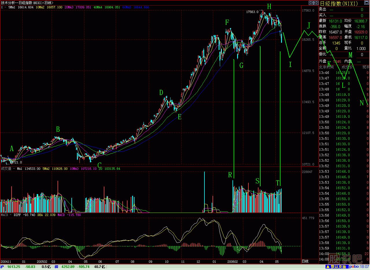(圖266-3)2006年7月21日檢查預測效果時(shí),日經(jīng)指數(NIXI)的日K線(xiàn)圖。其中“大刀砍”和“斷頭鍘刀”的形態(tài)非常標準,實(shí)際走勢與(圖266-2)中的H-I-J預測基本吻合,現在已走K,估計未來(lái)還會(huì )沿著(zhù)L-M-N的預測運行。