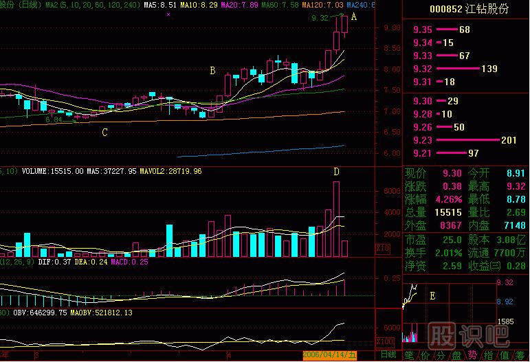 江鉆一把鉆,現在講沖擊鉆。(圖256-1)A處四根K線(xiàn)陽(yáng)線(xiàn)像不像沖擊鉆?B處是沖擊鉆把手,有個(gè)高點(diǎn)十字星K線(xiàn),是電扳扣,那么A就是鉆頭了。沖擊鉆頂緊天花板是什么感覺(jué)呢?是向上沖擊,在堅硬的天花板上打個(gè)洞出來(lái),是何等的穿透力量!E處是沖擊中的顫動(dòng),上面好像有阻力,分時(shí)走勢開(kāi)始橫走,這是很正常的,有時(shí)打了幾十分鐘,鉆頭分寸不進(jìn),突然,鉆頭撲空而進(jìn),甚至穿墻而過(guò),這就叫突破。鉆頭在突破時(shí),沖擊鉆的鉆體是不會(huì )穿墻而過(guò)的。股價(jià)在突破時(shí),千軍萬(wàn)馬一躍而過(guò),除非漲停板限制它前進(jìn),否則不撞南墻不回頭?,F在A(yíng)處的K線(xiàn)形態(tài),一旦向上突破,很可能連續出現幾個(gè)漲停板,抓住沖擊鉆,就抓住了暴漲前的個(gè)股,而且這種形態(tài)出現的頻率較高,每月有十幾次這樣的機會(huì )。