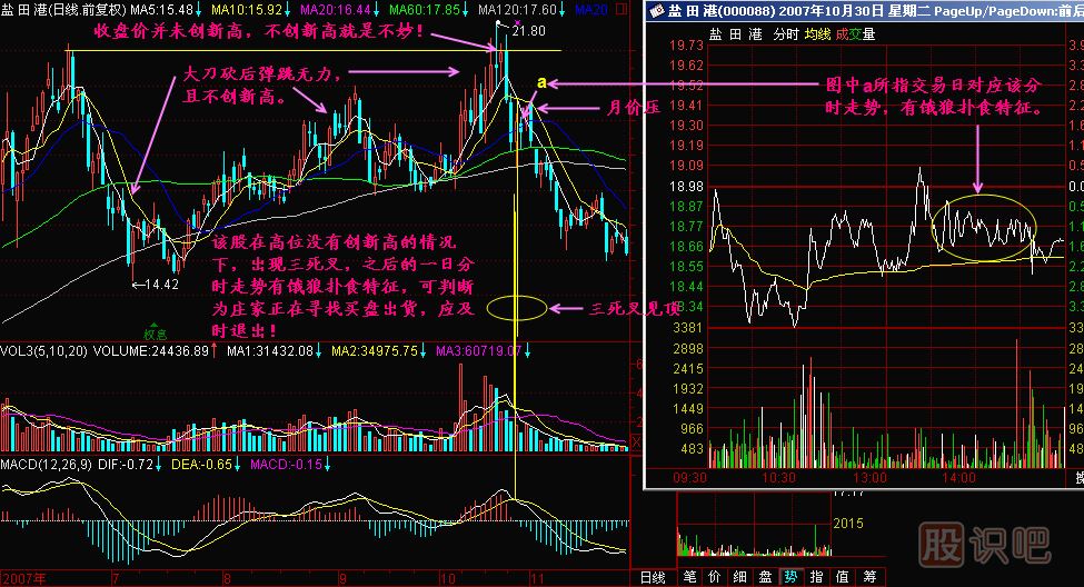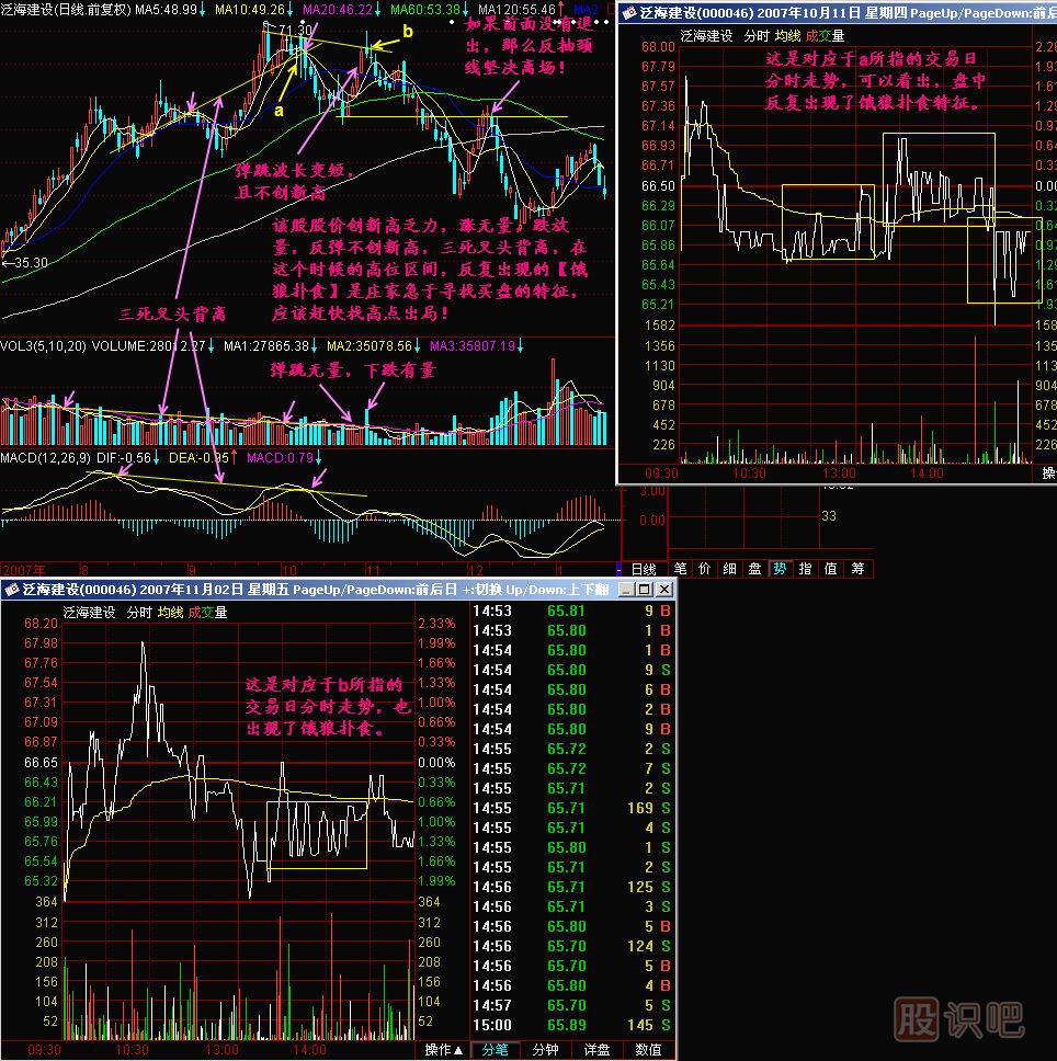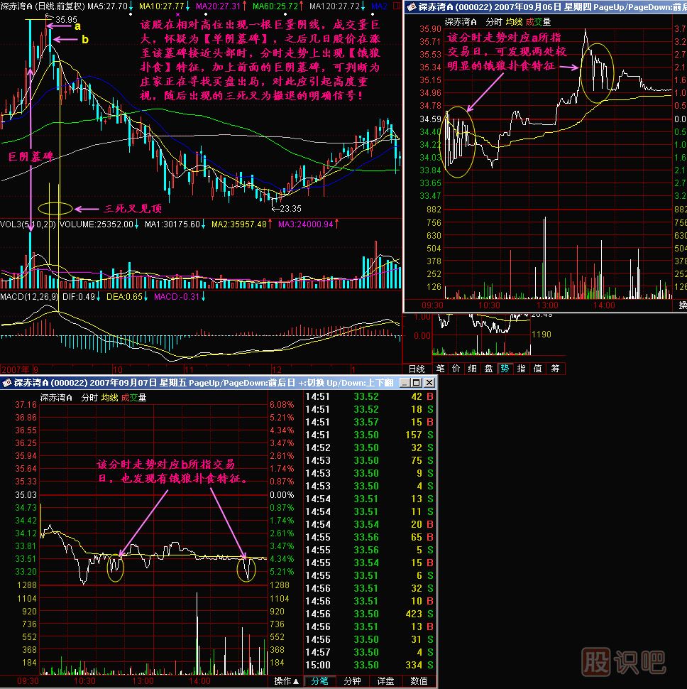 小結:分時(shí)走勢出現餓狼撲食是不好的征兆,特別這個(gè)走勢出現在日K線(xiàn)相對高位的話(huà),比如三死叉附近或者價(jià)壓附近的話(huà),是莊家正在尋找買(mǎi)盤(pán)賣(mài)出的特征,遇到這樣的個(gè)股可得倍加小心,最好馬上尋機退出,否則可能成為莊家出貨的犧牲品!