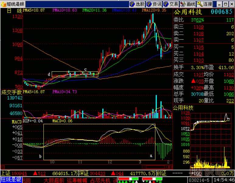 有一個(gè)同學(xué)今天要我們講一講000685公用科技,他覺(jué)得這個(gè)股票走得太怪了。是的,這個(gè)股票走得有些怪異。我們來(lái)看它幾個(gè)怪異的地方,見(jiàn)(圖216-1)所示: