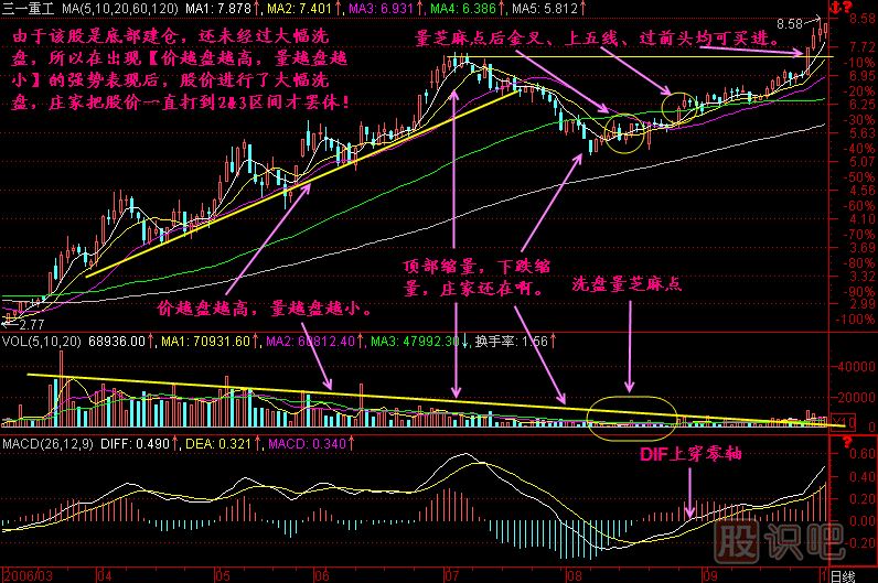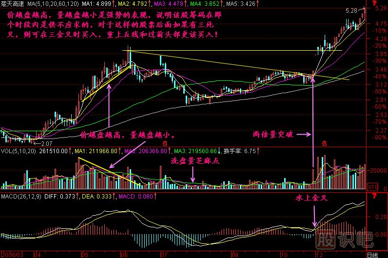 小結:價(jià)越盤(pán)越高,量越盤(pán)越小是強勢的表現,表明該股的籌碼處于供不應求狀態(tài),表明莊家對該股看好的程度,當然這其中也會(huì )混入大量的散戶(hù),所以這樣的走勢后面不排除有借指數回檔洗盤(pán)的可能,不管是否洗盤(pán),我們都有辦法對付它,如果三死叉洗盤(pán)的話(huà),我們就等待三金叉買(mǎi)入,或者重上五線(xiàn)買(mǎi)入、過(guò)前頭買(mǎi)入,總之這樣的股票如果在低位被發(fā)現,是不能放過(guò)的!