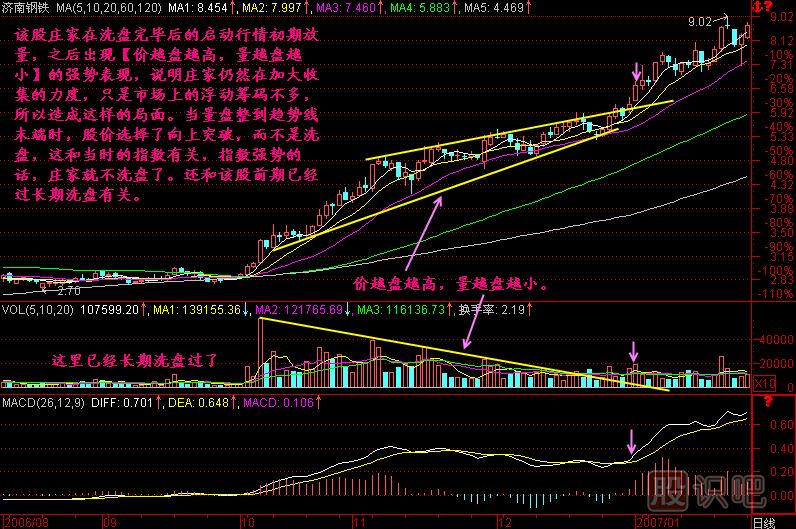 價(jià)格上升不是要有量的推動(dòng)才能漲嗎?因此它的量要越來(lái)越大才對啊。前面的走勢就是價(jià)漲量增?,F在價(jià)格在漲,量卻越來(lái)越小,怎么解釋?這種走勢的市場(chǎng)意義是,當主力猛烈地收集籌碼以后(我們不排除它在前面也收集過(guò)籌碼,可那時(shí)收集的籌碼量不多,只有這一次才把大量的籌碼收集進(jìn)來(lái)),由于跟風(fēng)盤(pán)比較多,主力就不漲了,意思是說(shuō)我不要了,我不建倉了,但靠散戶(hù)的追高,也能把價(jià)格追高一段路。在沒(méi)有量的情況下,莊家不出貨,一些散戶(hù)出點(diǎn)貨,另外一些散戶(hù)又要買(mǎi)進(jìn)點(diǎn)貨,這樣量就保持一個(gè)平衡狀態(tài),量是很小的,但價(jià)格確實(shí)是在漲,主力不用力氣它也會(huì )漲。當然,這種走勢后面又會(huì )隱藏著(zhù)新的隱患,莊家就會(huì )想:“咦,我不打它也會(huì )漲,這不是很多散戶(hù)都進(jìn)來(lái)了?那我將來(lái)如果把它做得很高,比如8元、12元,散戶(hù)不是就賺錢(qián)了嗎?這不行。他要想辦法做出一個(gè)隱蔽狀態(tài),假裝不做莊了,往下跌,這就叫洗盤(pán)。要把知道某些消息跟進(jìn)來(lái)占便宜的散戶(hù)趕出去,還要趕走哪些人呢?就是我們這些人,消息我們是不聽(tīng)的,但是你的圖形走出來(lái),一根旗桿拉起來(lái),沖進(jìn)2+3區間就買(mǎi)進(jìn)。俱樂(lè )部的同學(xué)們都是老手了,在a點(diǎn)打進(jìn)去,盈利的可能性就比較大,但他要把我們這些人趕出去,主力將來(lái)坐莊才會(huì )好一點(diǎn)。