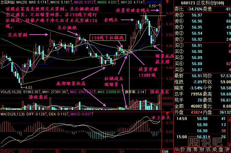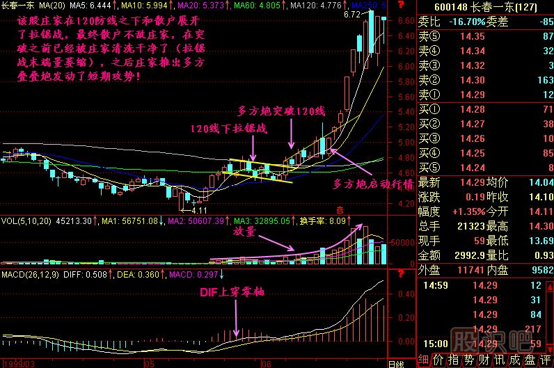 小結:120線(xiàn)下拉鋸戰是散戶(hù)消耗戰,散戶(hù)最終都將在拉鋸戰中戰敗而乖乖交出籌碼,在拉鋸戰末端一般都有量萎縮,說(shuō)明已經(jīng)達到莊家洗盤(pán)的目的,那么只要后期一根放量陽(yáng)線(xiàn)突破拉鋸戰壓力線(xiàn)和120防線(xiàn),行情就啟動(dòng)了,起碼要漲一段路。