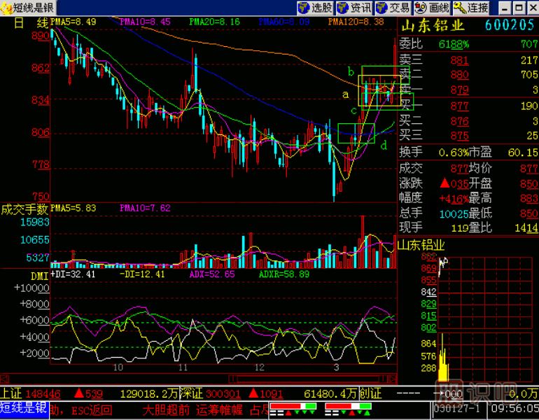 我們從這張圖紙上看得很清楚,它拉完大據以后緊跟著(zhù)往上突破,今天是突破以后的第三天。這種走勢怎么看待呢?實(shí)際上也有其巧妙之處。第一,它的攻擊力度大,它上攻的第一根陽(yáng)線(xiàn)從2-3區間直接穿過(guò)2&3區間,進(jìn)入2+3區間,氣勢澎湃,而且絕對量頂天立地,大于前面所有的成交量,形成了電桿與小草的對比,這是一輪行情轉勢的信號。也就是說(shuō),一個(gè)股票的長(cháng)期下跌趨勢,要想讓它拐彎向上,前面的小陽(yáng)線(xiàn)是沒(méi)有用的,靠它們拐彎不可能,真正能解決問(wèn)題的就是這根長(cháng)陽(yáng)線(xiàn)。多方以排山倒海之勢,一下沖過(guò)2&3區間達到2+3區間,不得不轉勢,但是轉勢同時(shí)也必須有一個(gè)調整,調整的位置也會(huì )相對低一點(diǎn)。為什么會(huì )低一點(diǎn)?第一是它本來(lái)就漲得太多了,需要回一下。第二是股價(jià)沿著(zhù)120線(xiàn)往下滑,有一種“我不做了的感覺(jué)”,那么里邊的人就要開(kāi)始跑出來(lái)。你跑出來(lái)我就拉上去,形成了一個(gè)與120均線(xiàn)斜率差不多的向下斜面,這在技術(shù)上叫旗形整理,像不像一面紅旗?然后就是旗面突破,從而一舉進(jìn)入2+3區間。我們只要在b點(diǎn)守候,誰(shuí)先過(guò)來(lái)就打誰(shuí),不過(guò)來(lái)就不打,每天總有幾個(gè)股票要過(guò)去的,特別是那些巨量跳空的個(gè)股,那就趕快出擊,回檔買(mǎi)進(jìn)。
