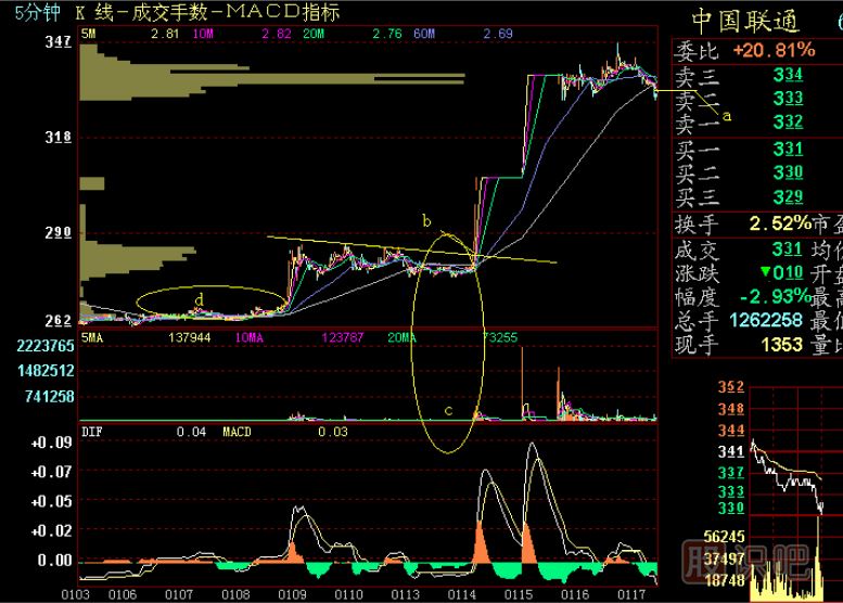 昨天我們讓大家用五分鐘K線(xiàn)來(lái)對付這種暴漲的個(gè)股,中國聯(lián)通就是連拉漲停板的個(gè)股,見(jiàn)(圖203-1)所示。在圖中可以看到,5、10、20個(gè)單位的三根快速平均線(xiàn)已經(jīng)切入到60、120單位平均線(xiàn)下面來(lái)了。在五分鐘K線(xiàn)圖上照樣遵循著(zhù)2+3理論,現在股價(jià)已經(jīng)從2+3區間通過(guò)2&3區間跑到2-3區間來(lái)了,就要構筑120下小平臺,然后往下跌,120下小平臺以后肯定是跳水。