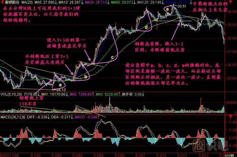 我們要看清楚a點(diǎn),120下小平臺可能就要出現了,現在就要退出來(lái),b這兒是我們切入的一個(gè)很好點(diǎn)位。我們上一次從日k線(xiàn)圖上面的底線(xiàn)切入,就是2.78元,那個(gè)時(shí)候是三個(gè)瞄準鏡,一號炮手、二號炮手、三號炮手,全部瞄準以后打進(jìn)去!從五分鐘K線(xiàn)圖上價(jià)位甚至可以再低一點(diǎn),不過(guò)沒(méi)什么意義,幾分錢(qián)也就算了。在b點(diǎn)可以切入,同樣遵循著(zhù)2+3理論,就是收集籌碼,抬起來(lái),然后橫向震蕩,把籌碼洗干凈,在c點(diǎn)把籌碼洗得干干凈凈,為后面的爆發(fā)準備好條件。所以我們說(shuō),股價(jià)當時(shí)沿著(zhù)下降趨勢線(xiàn)慢慢下滑,在五分鐘圖上就是沿著(zhù)這條高點(diǎn)連線(xiàn)下滑,直到把量洗得干干凈凈,這在五分鐘線(xiàn)上看得更清楚,洗到了最沒(méi)有量時(shí),實(shí)際上機會(huì )就來(lái)了。