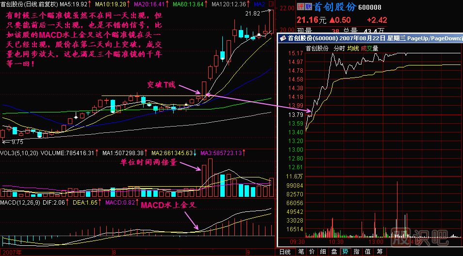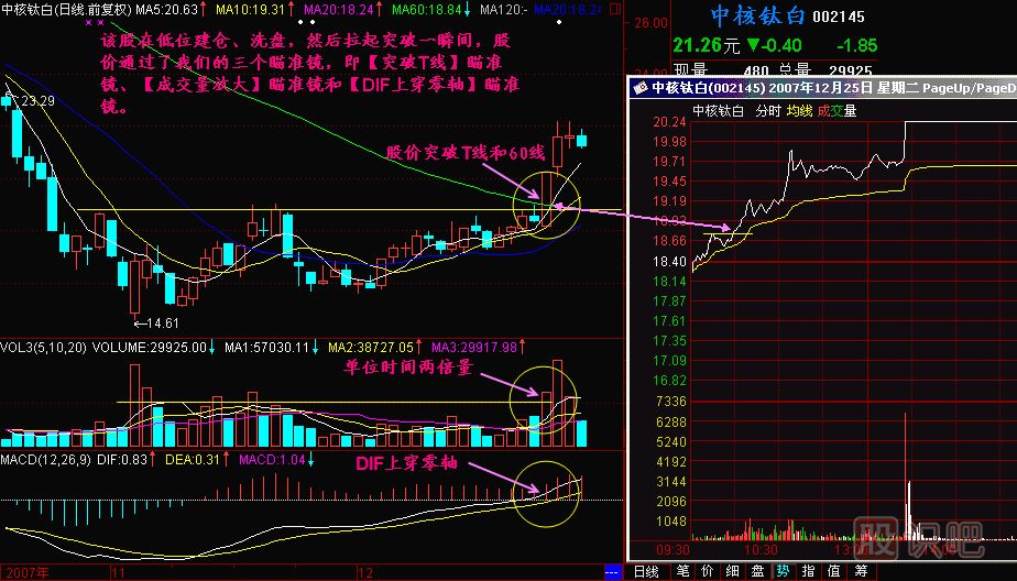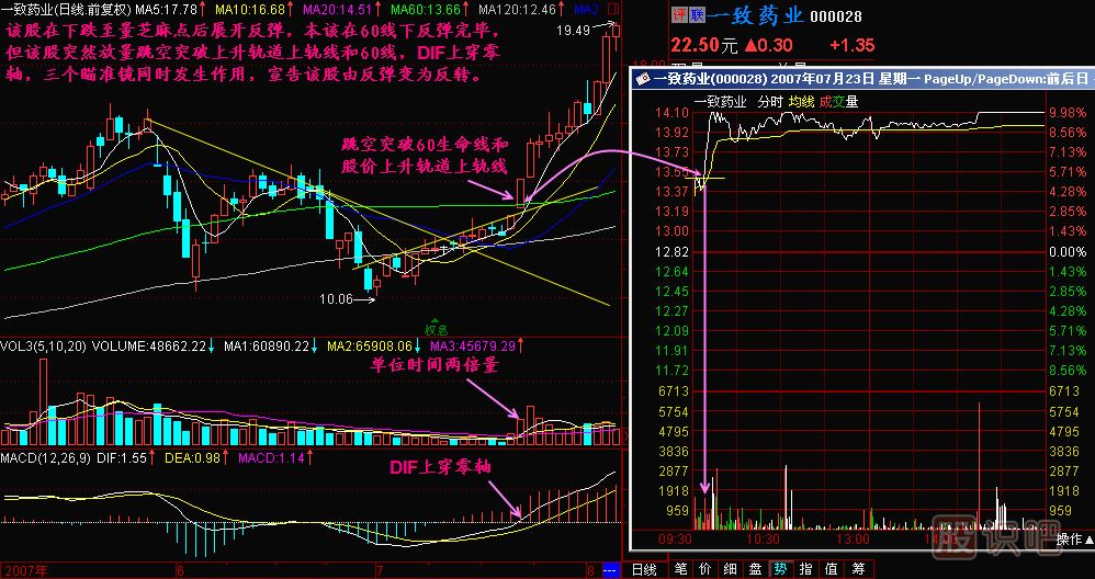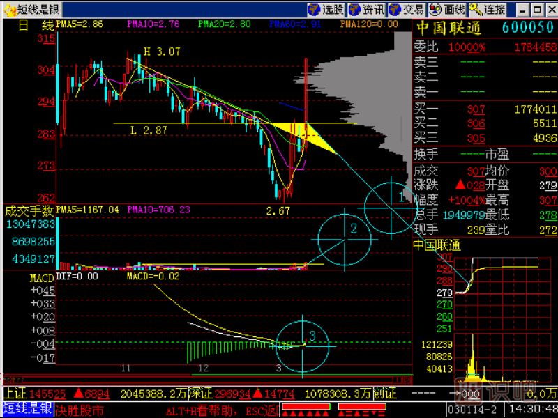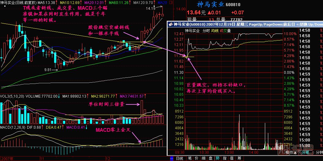 我們從股價(jià)的回檔開(kāi)始一直跟蹤分析到現在,說(shuō)什么呢?說(shuō)這個(gè)金三角一定能沖過(guò)去,現在股價(jià)正在上沖金三角,為什么不追呀!所以基本功學(xué)好了,追漲就有信心,就在股價(jià)上沖金三角的時(shí)候千軍萬(wàn)馬沖了過(guò)去,怎么沖的?我們要掌握好幾點(diǎn):第一個(gè),圖中我們畫(huà)了三個(gè)瞄準鏡,第一個(gè)瞄準鏡瞄在什么地方呀?就是2.87元這個(gè)地方,也就是說(shuō)只要股價(jià)能通過(guò)2.87元,我就打!千年追一回呀!這么明確的事情,此時(shí)不追更待何時(shí)!在分時(shí)走勢圖上我們就瞄在2.87元這個(gè)位置上,所有的火力都集中在這個(gè)地方,怪不得這個(gè)地方的成交量那么大,是不是我們的同學(xué)們都在這個(gè)地方使勁,千軍萬(wàn)馬殺了進(jìn)去,股價(jià)就一路上揚。第二個(gè)瞄準鏡瞄在什么地方呢?就是當成交量沖過(guò)前面這個(gè)5日平均量的最高點(diǎn)的一瞬間,就開(kāi)始動(dòng)手。第三個(gè)瞄準鏡是瞄準MACD的后金叉,就在DIF上穿0.00的一瞬間,千萬(wàn)發(fā)子彈就出去了。在我們廣通技術(shù)里邊這三個(gè)瞄準鏡被稱(chēng)做什么呢?第一個(gè)是T線(xiàn)瞄準鏡、第二個(gè)是成交量過(guò)前頭瞄準鏡、第三個(gè)是DIF零位瞄準鏡。這三個(gè)瞄準鏡如果同時(shí)發(fā)生作用的話(huà),此時(shí)此刻就是開(kāi)火的時(shí)候,也是我們千年追一回的千載難逢的機會(huì )。