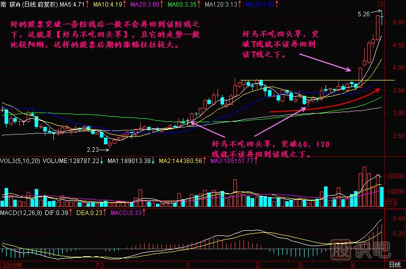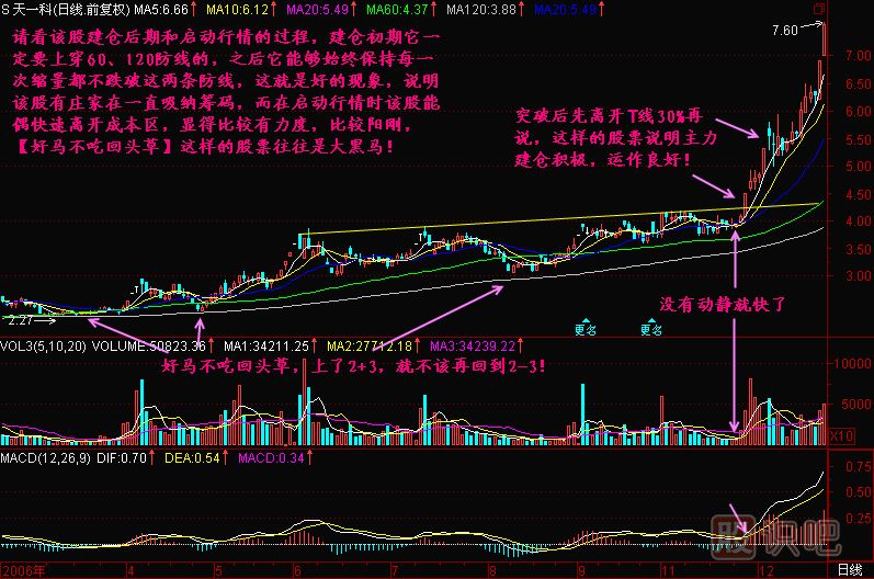 而對于能夠在大盤(pán)見(jiàn)底開(kāi)始上漲之后做到好馬不吃回頭草的股票,說(shuō)明主力決心堅決,且資金實(shí)力較強!他比較看好該股的后市,也許基本面有什么不為人知的利好,而該利好只有主力知道。這樣的股票往往在突破一條防線(xiàn)之后就不會(huì )再回到該防線(xiàn)之下,且股價(jià)走勢比較有陽(yáng)剛之氣!突破T線(xiàn)后往往能夠快速拉離成本區一段路,這樣的股票除了主力自身較自信外,還表現一個(gè)實(shí)質(zhì),主力不肯給散戶(hù)過(guò)多逢低吸納的機會(huì ),這樣的股票后期漲幅往往較大!